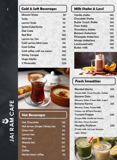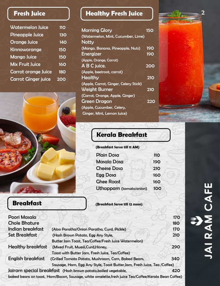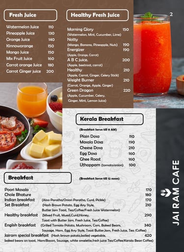 "Visit Jairam Cafe, Food & Drink in beautiful Varkala, Kerala. Enjoy fresh food, coffee, and refreshing drinks. Contact us today for inquiries, orders or a relaxing cafe experience."